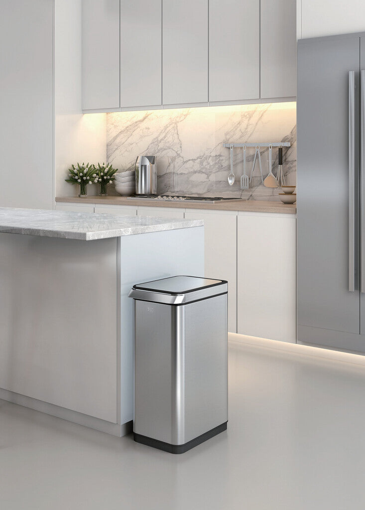 Fraaie afvalbak van geborsteld RVS met fingerprint proof coating. De brede aluminium touch balk zorgt voor het makkelijk openen van het deksel met de hand, elleboog, heup of knie. Opent geruisloos en voorzien van kunststof binnenemmer. De stay-open functie houdt het deksel open, voor het makkelijk schoonmaken of wisselen van de afvalzak. Slank design, uitermate geschikt voor smalle ruimten.