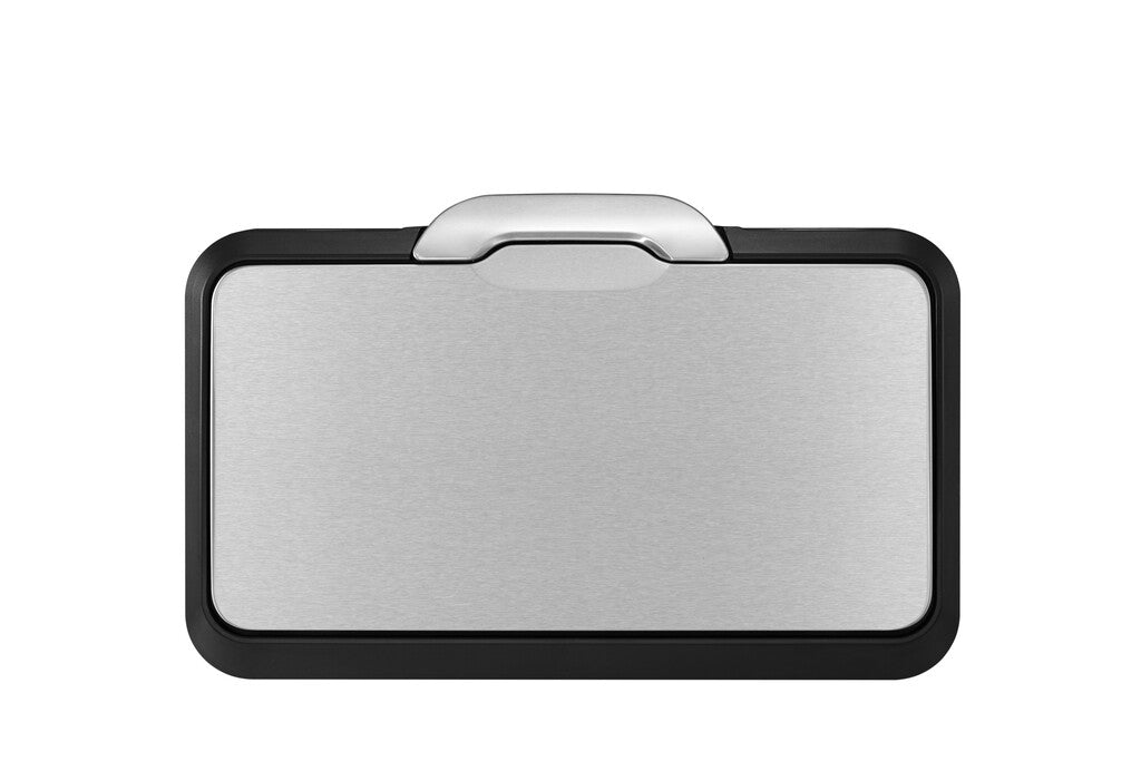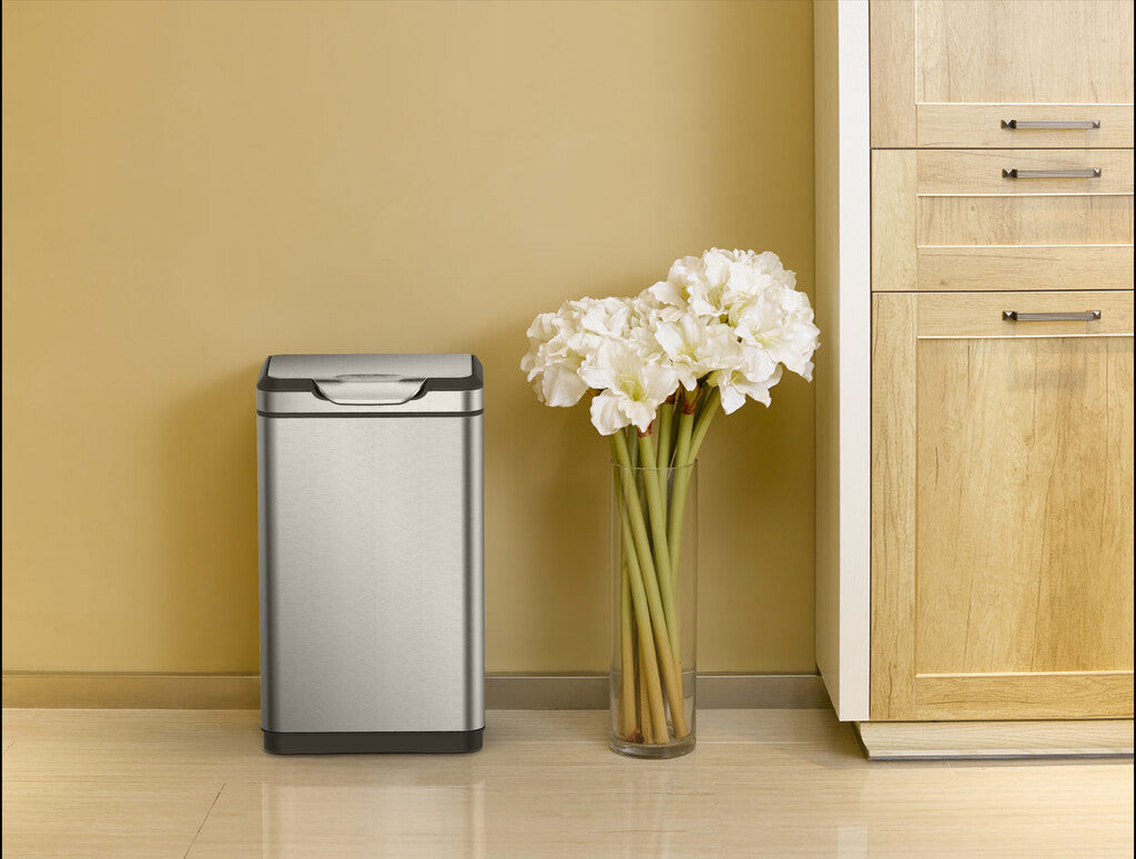 Fraaie afvalbak van geborsteld RVS met fingerprint proof coating. De brede touch knop zorgt voor het makkelijk openen van het deksel met de hand, elleboog, heup of knie. Opent geruisloos en voorzien van 2 kunststof binnenemmers. De stay-open functie houdt het deksel open, voor het makkelijk schoonmaken of wisselen van de afvalzak.