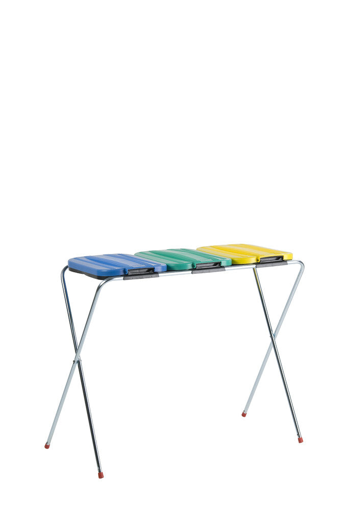 Stalen, opklapbaar frame met drie kunststof zakhouders met deksel.