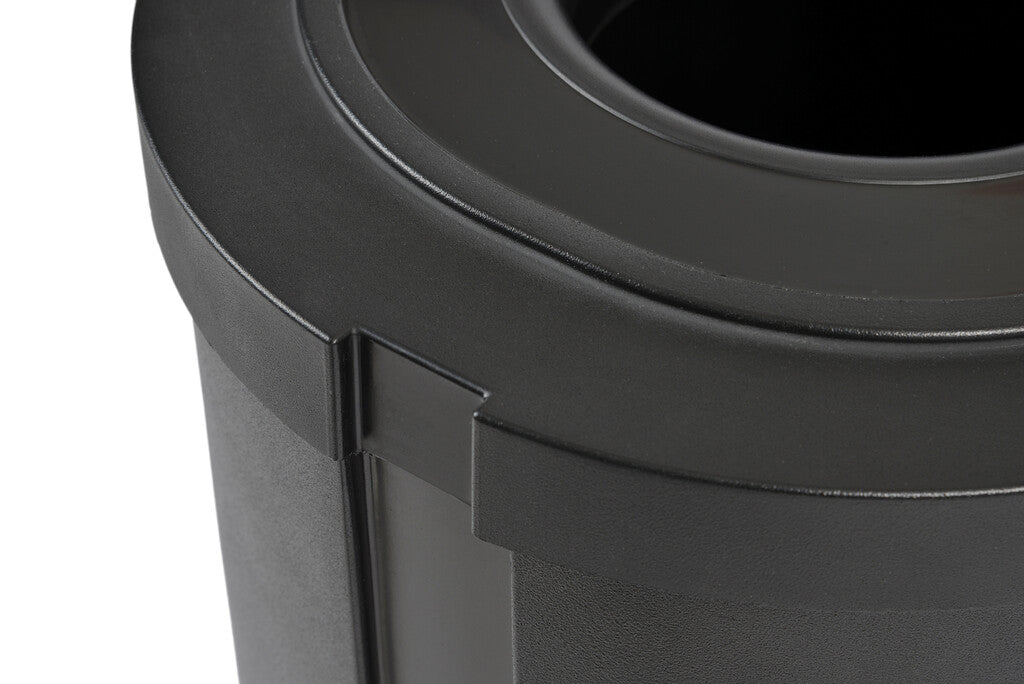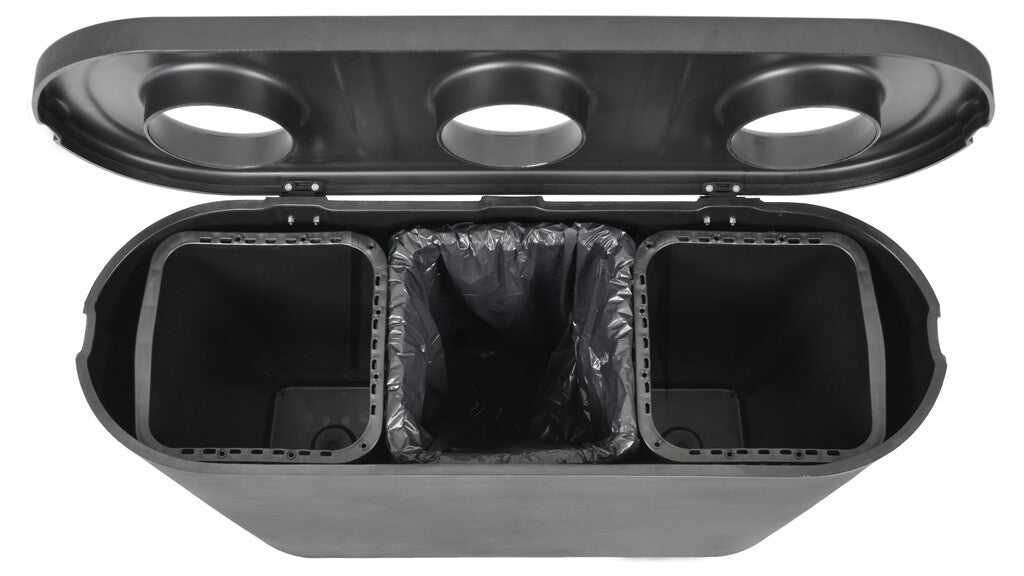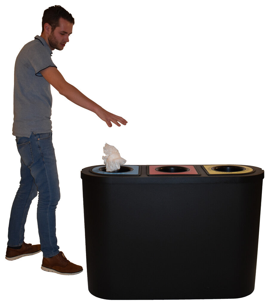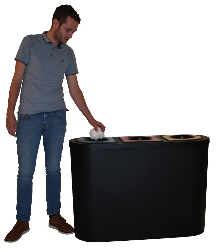 Afvalscheidingsunit voor 3 afvalstromen: Papier, Kunststof, Restafval (in 4 talen). Een duurzame, circulaire oplossing vervaardigd uit tot 100% gerecycled kunststof (HDPE) van uitstekende kwaliteit garandeert een lange levensduur. Voorzien van 3 afzonderlijke vloeistofdichte kunststof inzetbakken (3x 45 liter) die gemakkelijk via de open te klappen deksel te legen zijn. Deksel blijft door het speciale scharnier geopend in iedere gewenste stand. Eenvoudig en hygiënisch te reinigen. Gemakkelijk te verplaatsen. Biedt met zijn slanke, plaatsbesparende design een prima oplossing in zowel kantoren en scholen als in openbare ruimten.