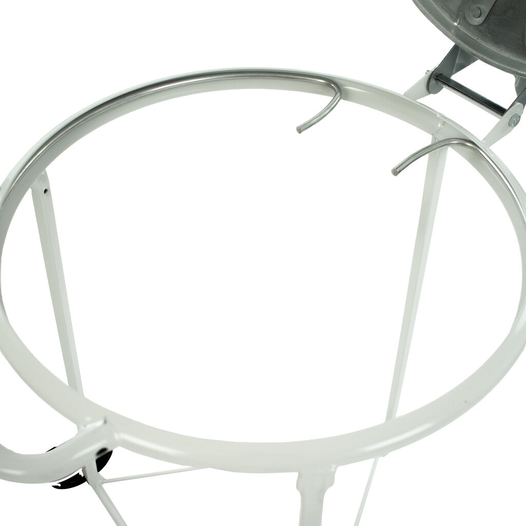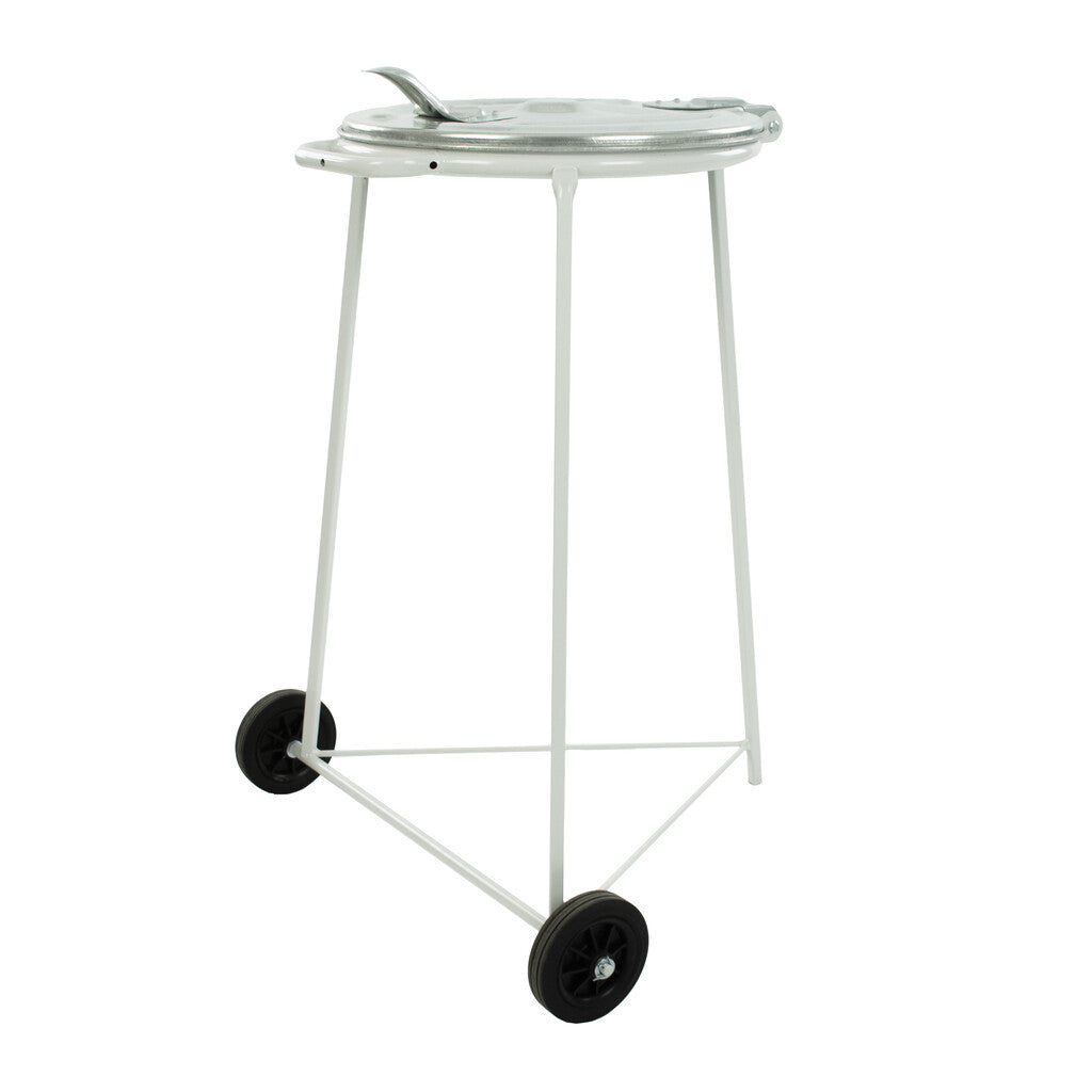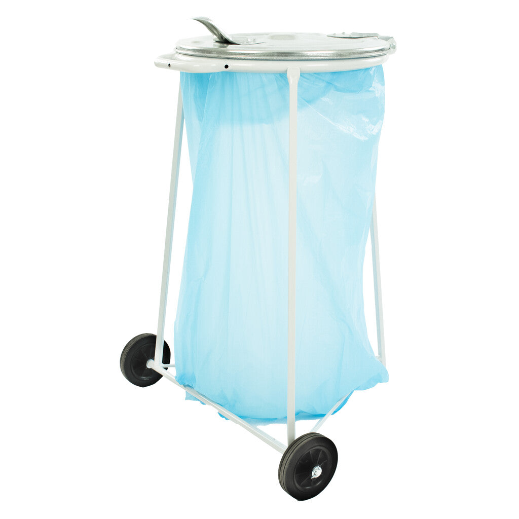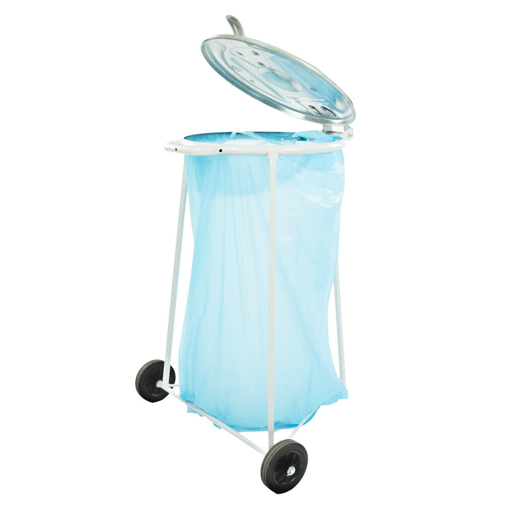 Afvalzakstandaard op 2 wielen met staalverzinkt deksel en afvalzakhouderklemring om de afvalzak gemakkelijk en snel te klemmen.