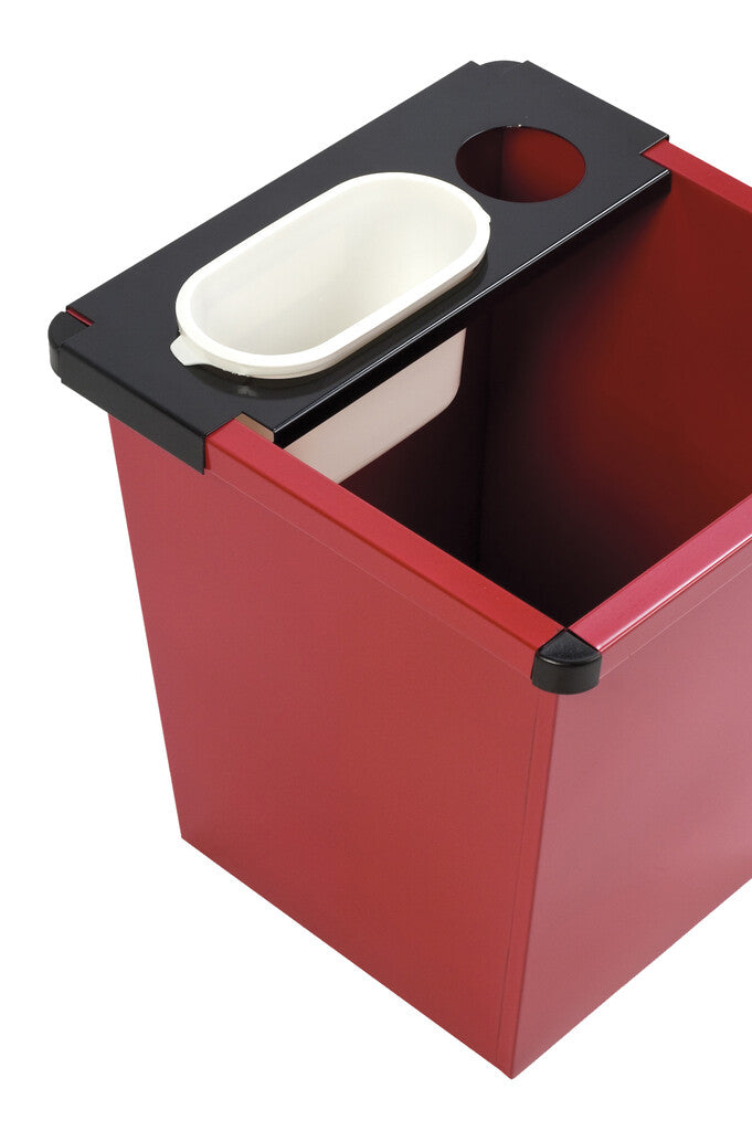 Metalen papierbak met kunststof stoothoeken. Optioneel te gebruiken voor afvalscheiding. Afmeting boven 30x30 cm, onder 24,5x24,5 cm.