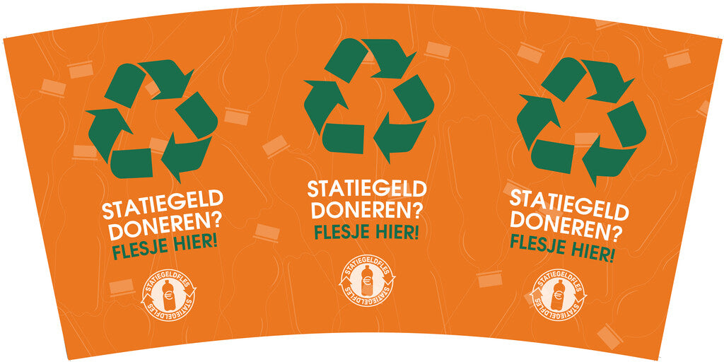 Opvallende wikkel om het publiek aan te moedigen plastic flesjes te verzamelen en te recyclen. Pvc wikkel voorzien van dubbelzijdig tape zodat deze snel en eenvoudig om de Petman geplaatst kan worden. Vanaf 5 stuks ook mogelijk met eigen ontwerp, vraag naar de mogelijkheden.