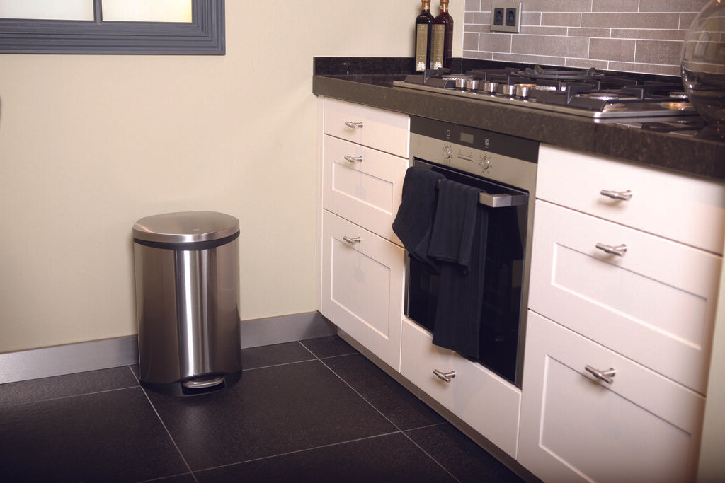 Opvallende schelpvormige pedaalemmer voorzien van gedempt deksel en kunststof binnenemmer. Fingerprint Proof.